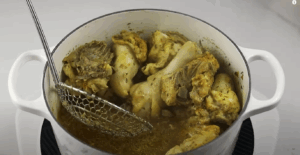- Add thyme, curry powder, bay leaves, salt, and seasoning cubes.